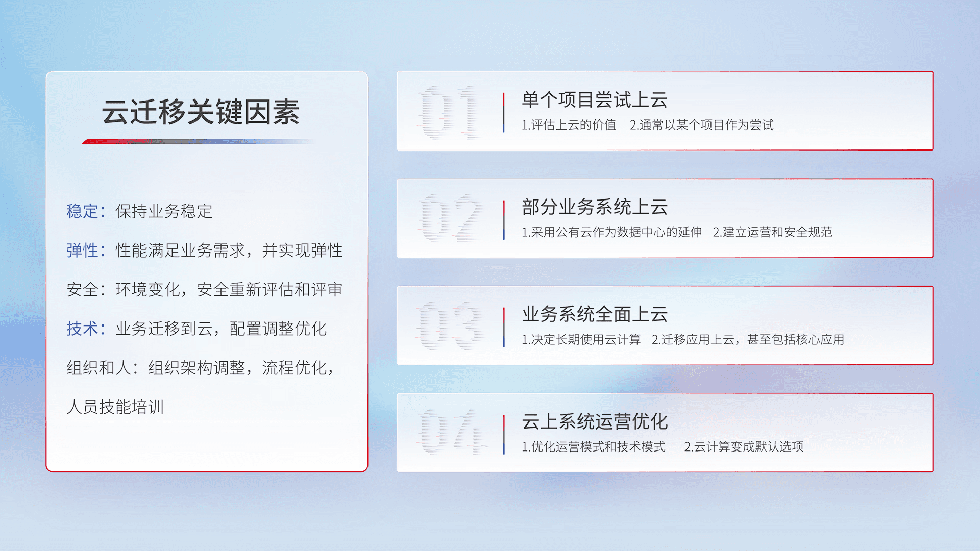 结合实际业务,,从规划设计、、云平台选型、、云原生改造、、、、数据迁移、、集成交付,,,迁移全过程为客户识别最佳上云路径,,做好风险识别管理,,,,设计网络架构、、身份权限、、、、安全审计合规、、、、操作审计、、、、日志审计、、监控告警策略、、、、多站点容灾设计等,,对云上基础设施进行整体规划,,,提升IT治理水平,,,以满足弹性、、、、高可用、、、、高性能的需求。。。。