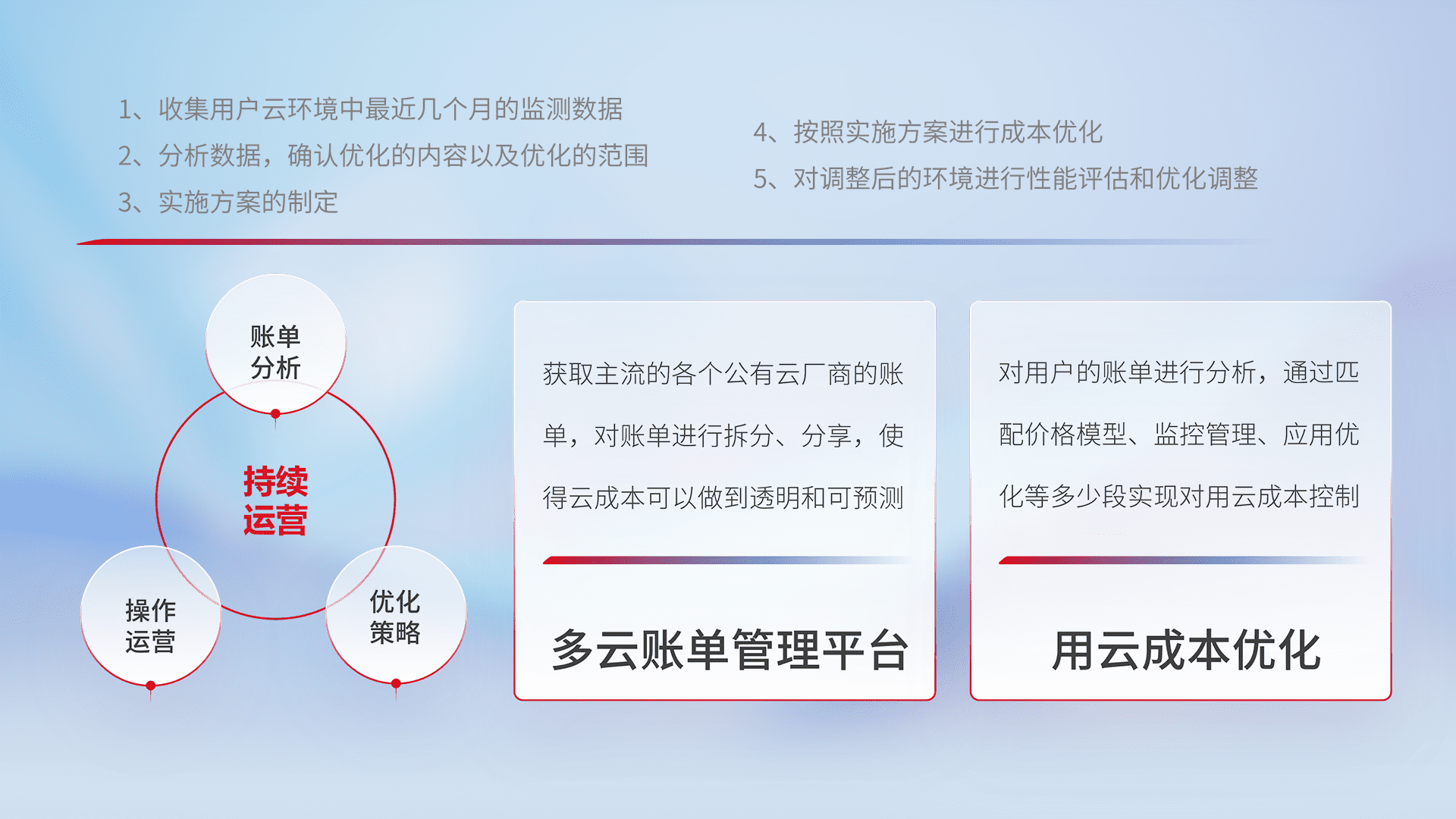 通过多云纳管,,,,以统一的资源数据模型把客户的云资源进行抽象和封装,,,进而实现对多云资源的统一操作,,保障云资源管理的可靠性、、、稳定性与可用性。。。量身定制化运维内容,,配置、、开发运维、、补丁管理、、、备份、、、监控、、、、认证和访问管理、、、、审计和日常巡检等,,保障在用云过程中的可靠度,,,稳定度以及高可用率。。。。