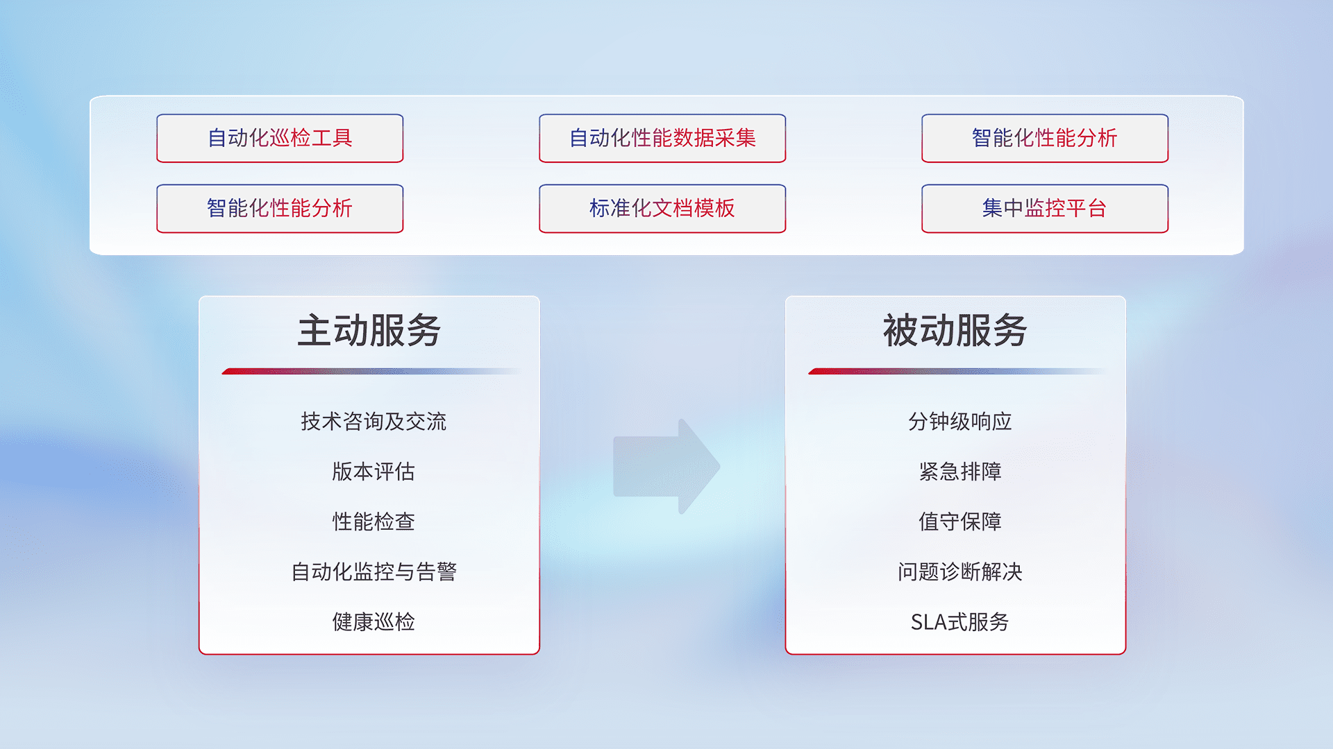 智能化工具和标准化文档,,,保障服务质量,,,,提供主动服务(包含技术咨询、、、版本评估、、、性能检查、、自动化监控与告警、、、、健康巡检)和被动服务包含(分钟级响应、、紧急排障、、、值守保障、、问题诊断解决、、SLA服务)。。。